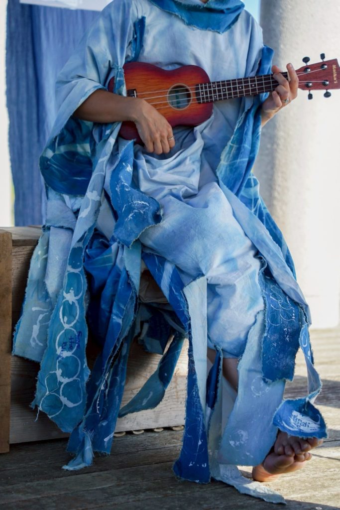 海アートのワークショップ。端切れに思い思いのアートを描き、一つのワンピースを完成させました